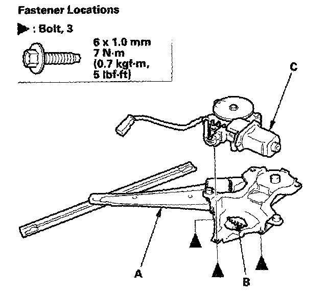 8. Scribe a line across the regulator (A) and sector gear (B). Connect a 12 Vbattery Supply to the Power window motor, and move the regulator until you can remove the bolts securing the Power window motor (C).
