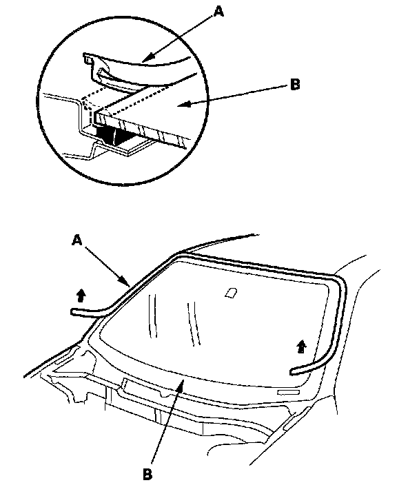 2. Remove the molding (A) from the edge of the windshield (B). If necessary, cut the molding with a utility knife.