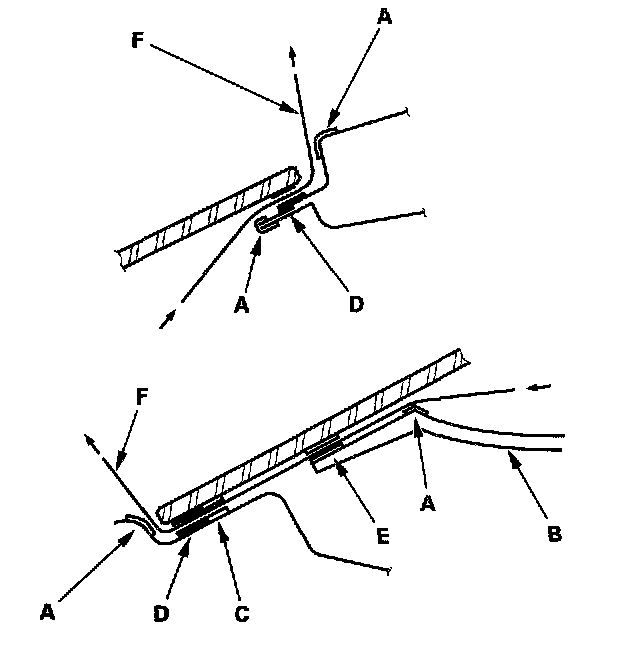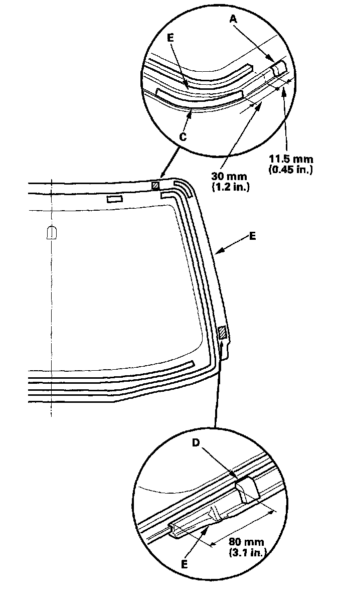 13. Glue the molding upper seal (A) butyl tape (coupe) (B) or molding Corner Seal (Sedan) (C) and molding side seal (D) to the molding (E). Be careful not to touch the windshield where adhesive will be applied.