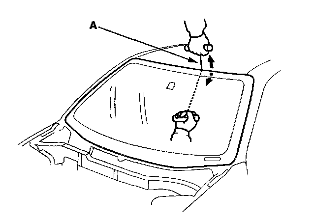 5. With a helper on the outside, pull the piano wire (A) back and forth in a sawing motion. Hold the piano wire as close to the windshield as possible to prevent damage to the body and dashboard. Carefully cut through the rubber dam and adhesive around the entire windshield.