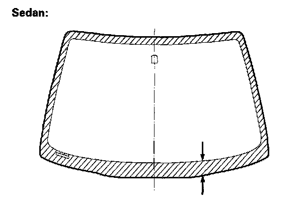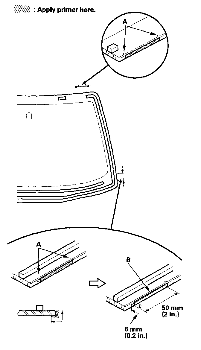 11. Apply primer (3M N-200, or equivalent) to the areas between the alignment marks (A), and glue the adhesive tape (Sedan) (B) (NITTO 501, or equivalent) to the edge of the windshield. Be careful not to touch the windshield where adhesive will be applied.