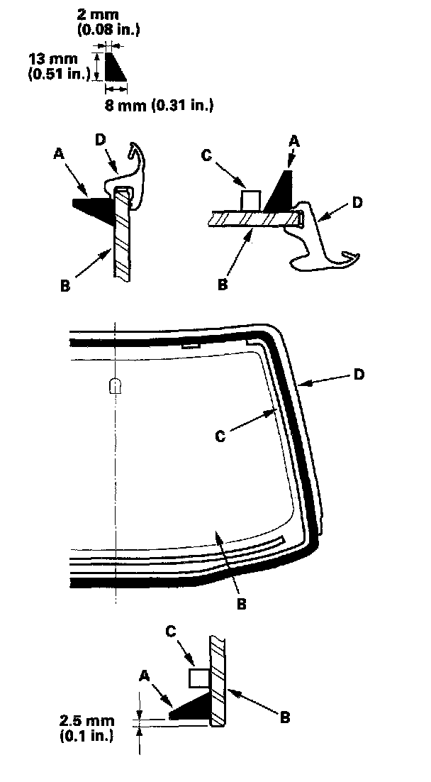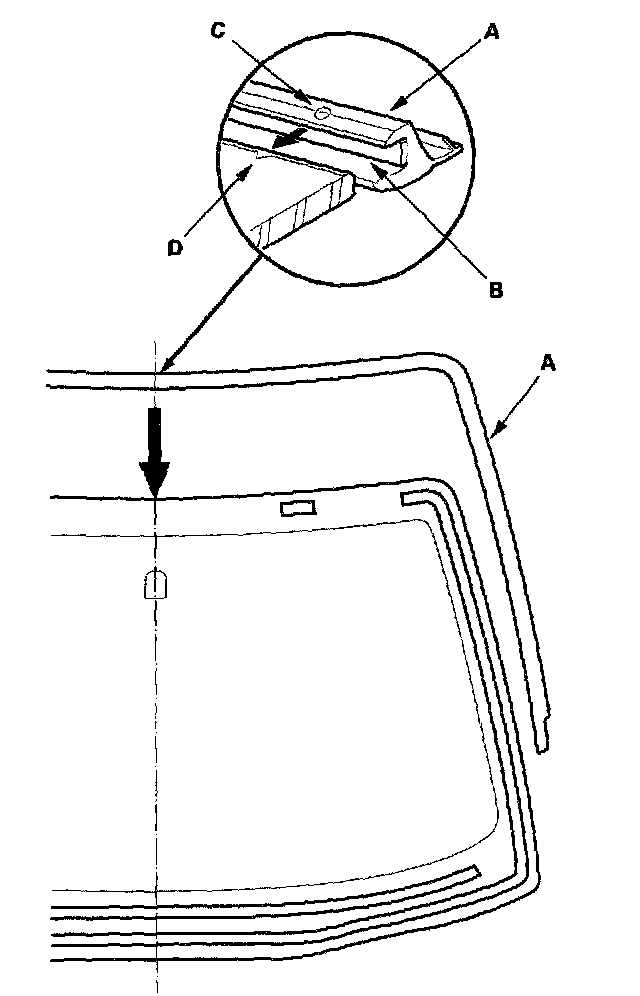 21. Pack adhesive into the cartridge without air pockets to ensure continuous delivery. Put the cartridge in a caulking gun, and run a bead of adhesive (A) around the edge of the windshield (B) between the dam (C) and molding (D) as shown. Apply the adhesive within 30 minutes after applying the glass primer. Make a slightly thicker bead at each corner.