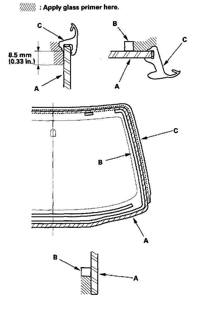 17. With a sponge, apply a light coat of glass primer around the edge of the windshield (A) between the dam (B) and molding (C) as shown, then lightly wipe it off with gauze or cheesecloth: