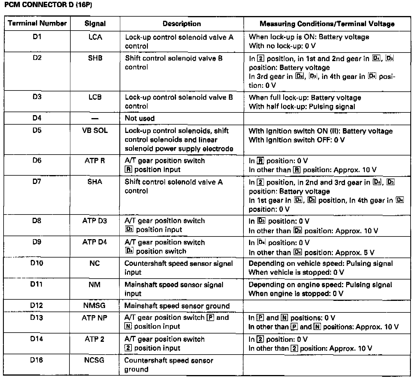 A/T Control System:The PCM terminal voltage and measuring conditions are shown for the connector terminals that relate to the A/T control system. The other PCM terminal voltage and measuring conditions are described under Computers and Control Systems/Normal Scan Data Values.