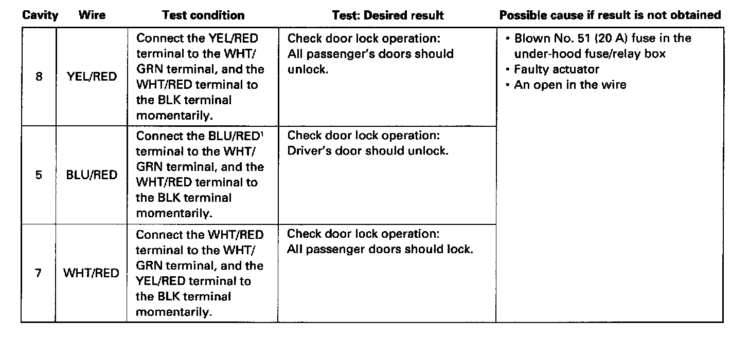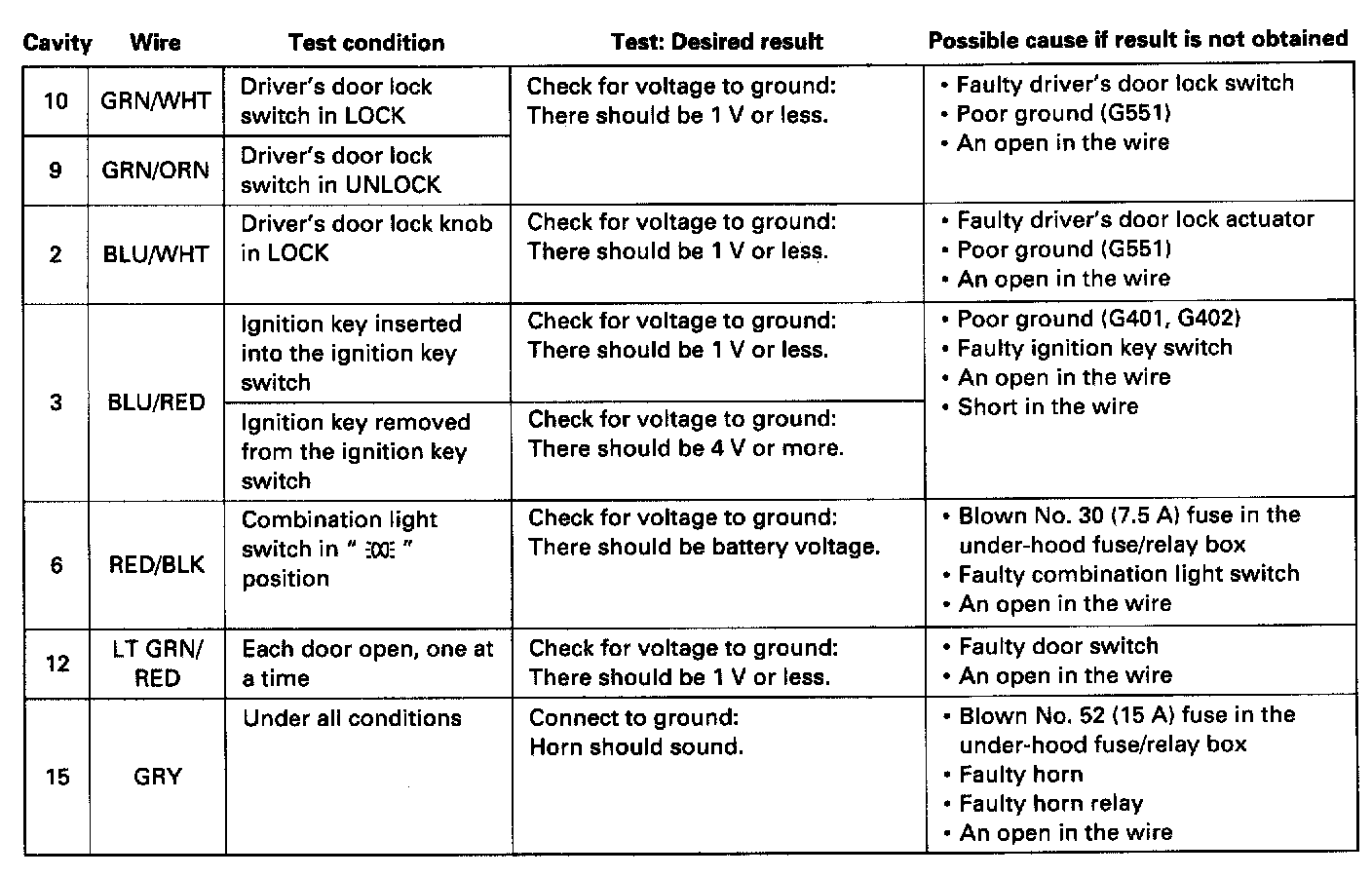 - If the terminals look OK, make the input tests shown in the table at the connector.