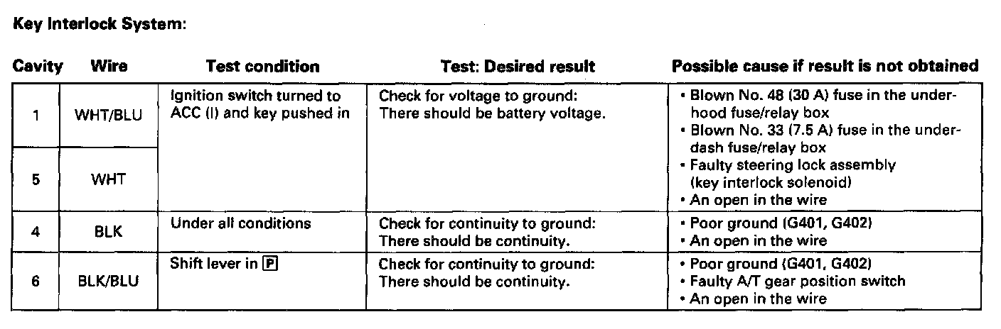 NOTE: If the shift lock solenoid clicks when the ignition switch is turned ON (II) and you step on the brake pedal (with the shift lever in [P]), the shift lock system is electronically normal; if the shift lever cannot be shifted from [P], test the A/T gear position switch, park pin switch.