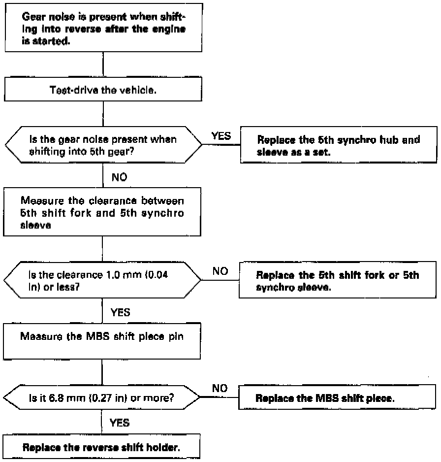 REVERSE GEAR NOISE REDUCTION SYSTEMWhenever the clutch pedal is depressed to shift into reverse, the mainshaft continues to rotate because of its inertia. The resulting speed difference between mainshaft and reverse idler gear produces gear noise. The reverse gear noise reduction system employs a cam plate which was added to the reverse shift holder. When shifting into reverse, the 5th/reverse shift piece, connected to the shift lever, rotates the cam plate. This causes the 5th synchro set to stop the rotating mainshaft. As there is no speed difference between mainshaft and reverse idler gear, there will be less gear noise.