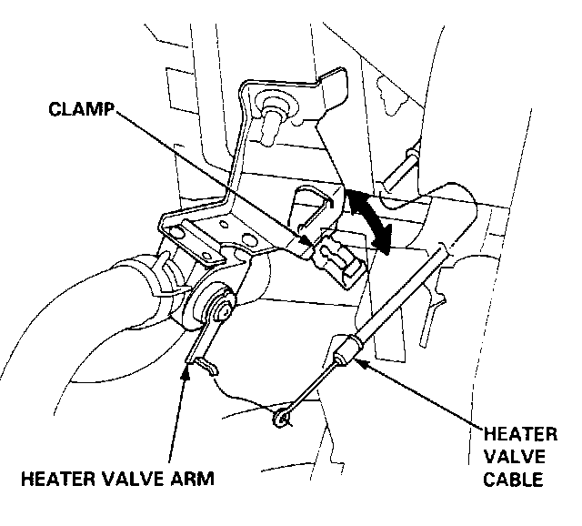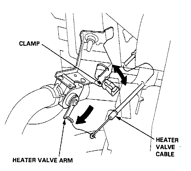 1. From under the hood, disconnect the heater valve cable from the heater valve.2. From under the dash, disconnect air mix control cable housing from the cable housing from the cable clamp.
