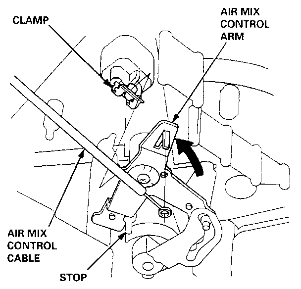5. Hold the air mix control arm against the stop, then snap the air mix control cable housing into the cable clamp.