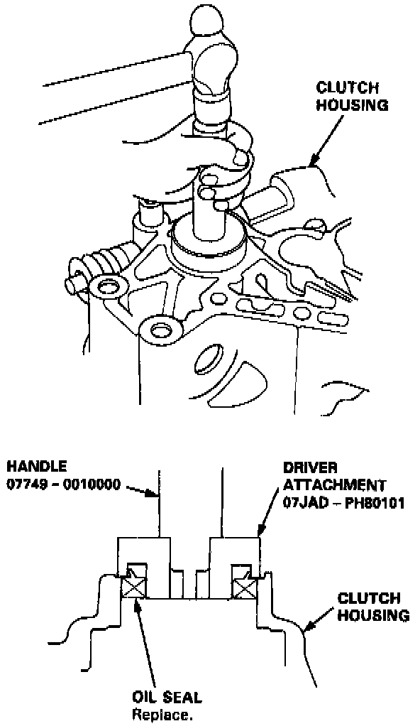 2. Install the oil seal into the clutch housing using the special tools as shown.