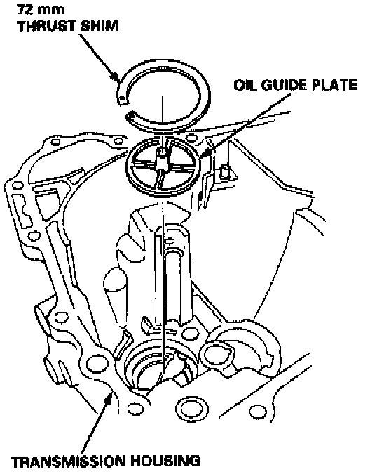 9. Remove the 72 mm thrust shim and the oil guide plate from the transmission housing.