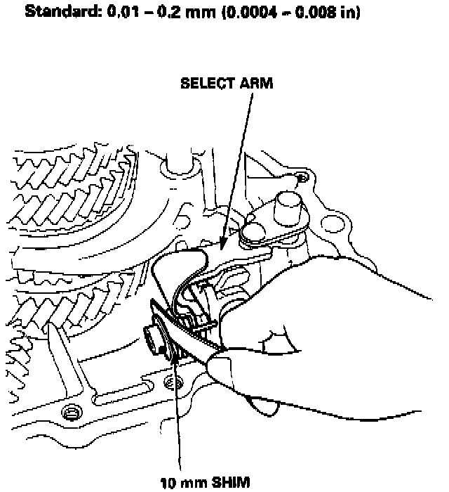 7. Measure the clearance between the select arm and the 10 mm shim.