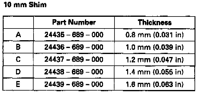 8. If the clearance is not within the standard, select and install the appropriate 10 mm shim for the correct clearance from the chart.