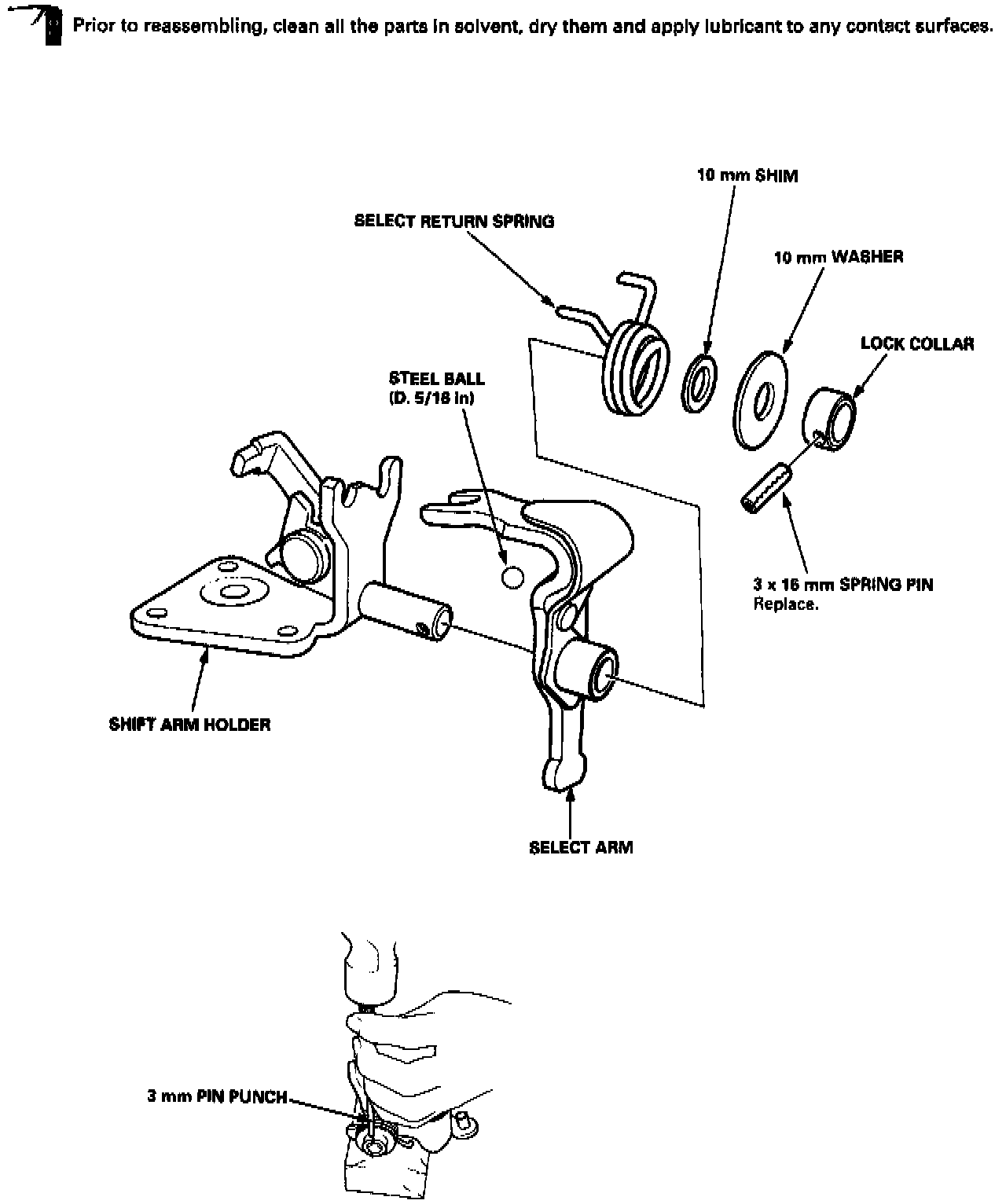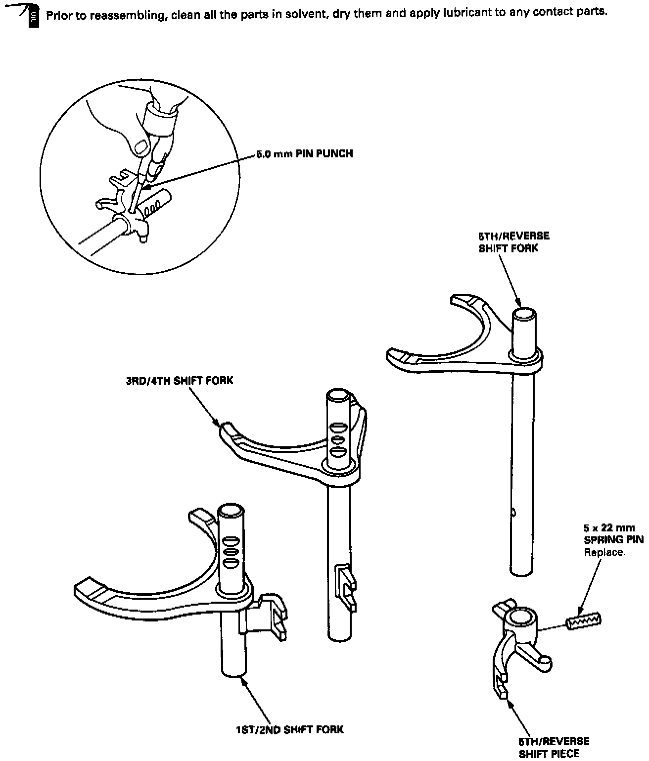 OIL: Prior to reassembling, clean all the parts in solvent, dry them, and apply lubricant to any contact surfaces. The 3rd/4th and the 5th synchro hubs, however, should be installed with a press before lubricating them.