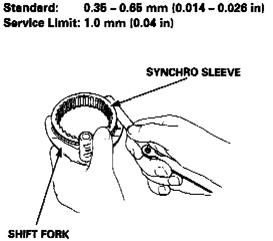1. Measure the clearance between each shift fork and its matching synchro sleeve.