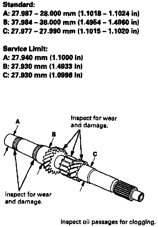 1. Inspect the gear surfaces and the bearing surfaces for wear and damage, then measure the mainshaft at points A, B, and C. If any parts of the mainshaft are less than the service limit, replace mainshaft with a new one.