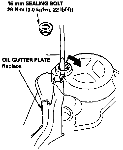 18. Bend the hook of the oil gutter plate, then install the 16 mm sealing bolt.