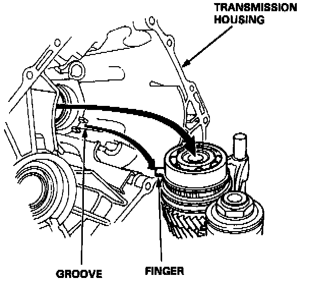 21. Install the transmission housing by aligning the groove in the housing with the finger on the stop ring.