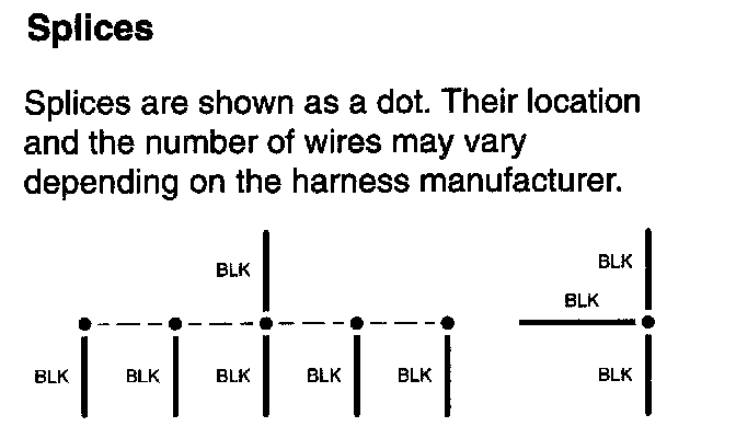 Splices are shown as a dot. Their location and the number of wires may vary depending on the harness manufacturer.