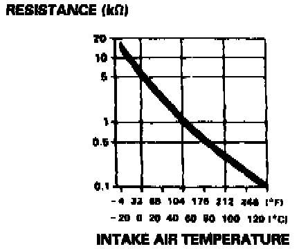 The IAT Sensor is a temperature dependant resistor (thermistor). The resistance of the thermistor decreases as the intake air temperature increases as shown above.