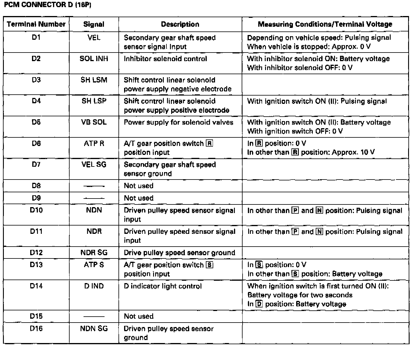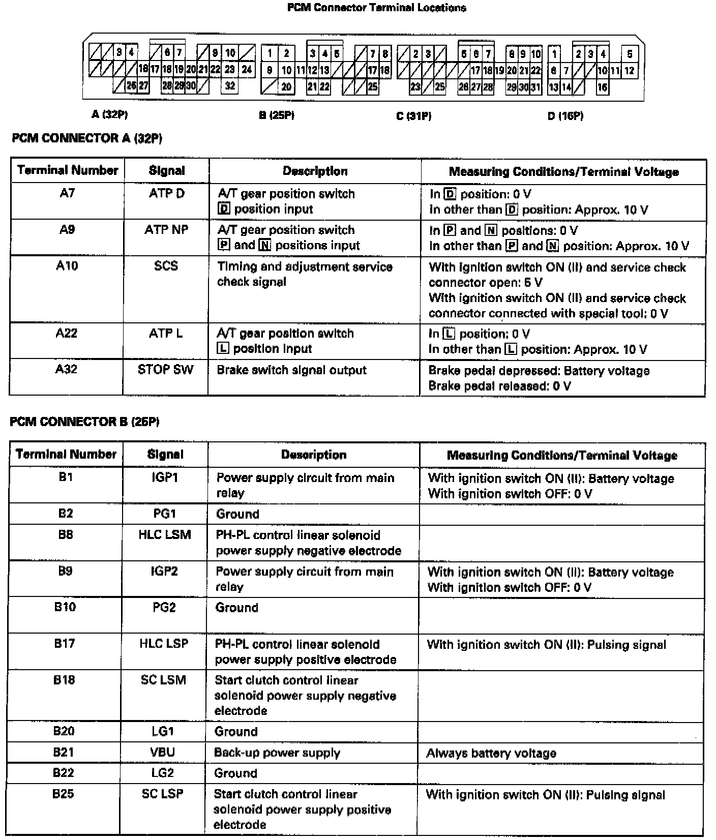 A/T Control System:The PCM terminal voltage and measuring conditions are shown for the connector terminals that relate to the A/T control system. The other PCM terminal voltage and measuring conditions are described under Computers and Control Systems/Normal Scan Data Values.