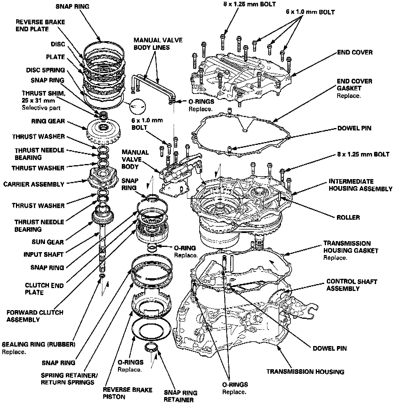 17. Remove the roller and push the control shaft assembly toward the outside of the transmission housing, then remove the intermediate housing (four bolts).