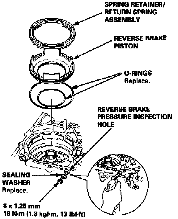 14. Apply air pressure to the inspection hole to remove the reverse brake piston.