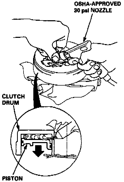 6. Wrap a shop rag around the clutch drum, and apply air pressure to the fluid passage to remove the piston. Place a finger tip on the other end while applying air pressure.