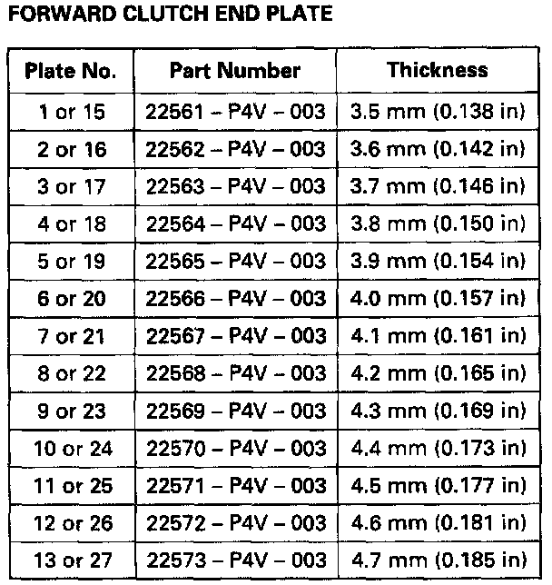 15. If the clearance is out of tolerance, select a new clutch end plate from the following table, then recheck.