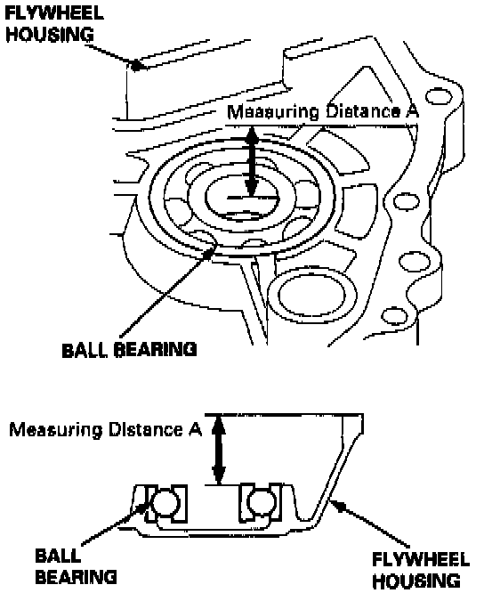 1. Measure the distance between the flywheel housing surface and the ball bearing as shown, then note the measurement (Measurement A).
