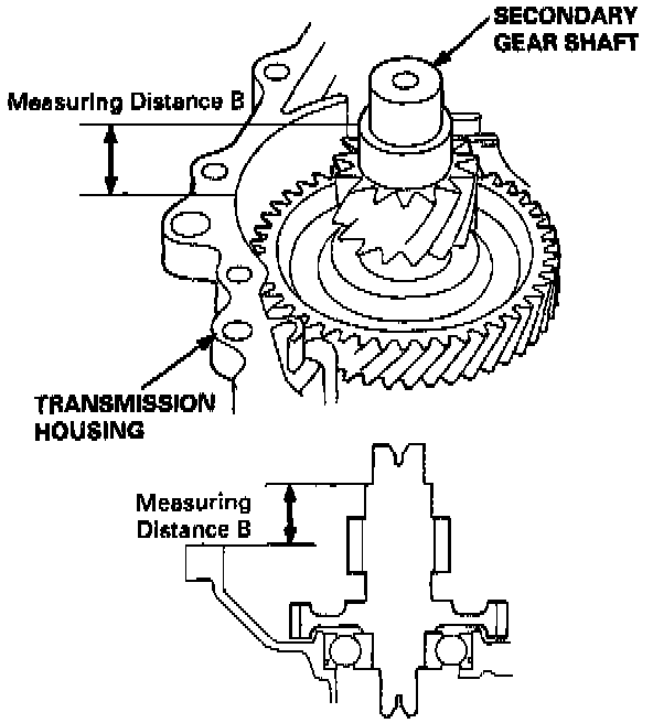 3. Measure the distance between the transmission housing surface and the thrust washer mounting surface of the secondary gear shaft as shown, then note the measurement (Measurement B).