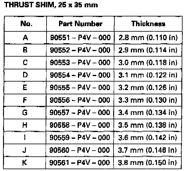 5. Select the 25 x 35 mm thrust shim from the following the table.