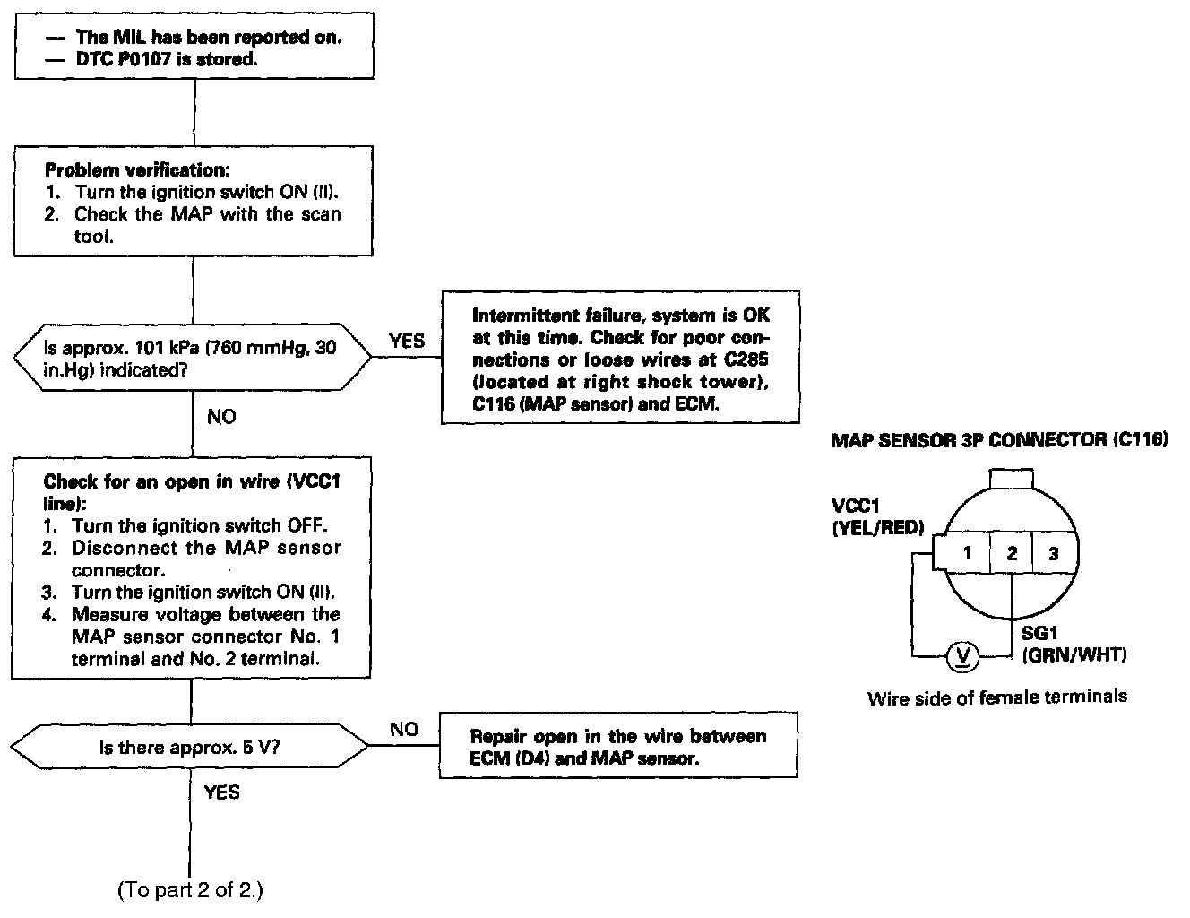 The scan tool indicates Diagnostic Trouble Code (DTC) P0107: A low input (high vacuum) problem in the Manifold Absolute Pressure (MAP) sensor.