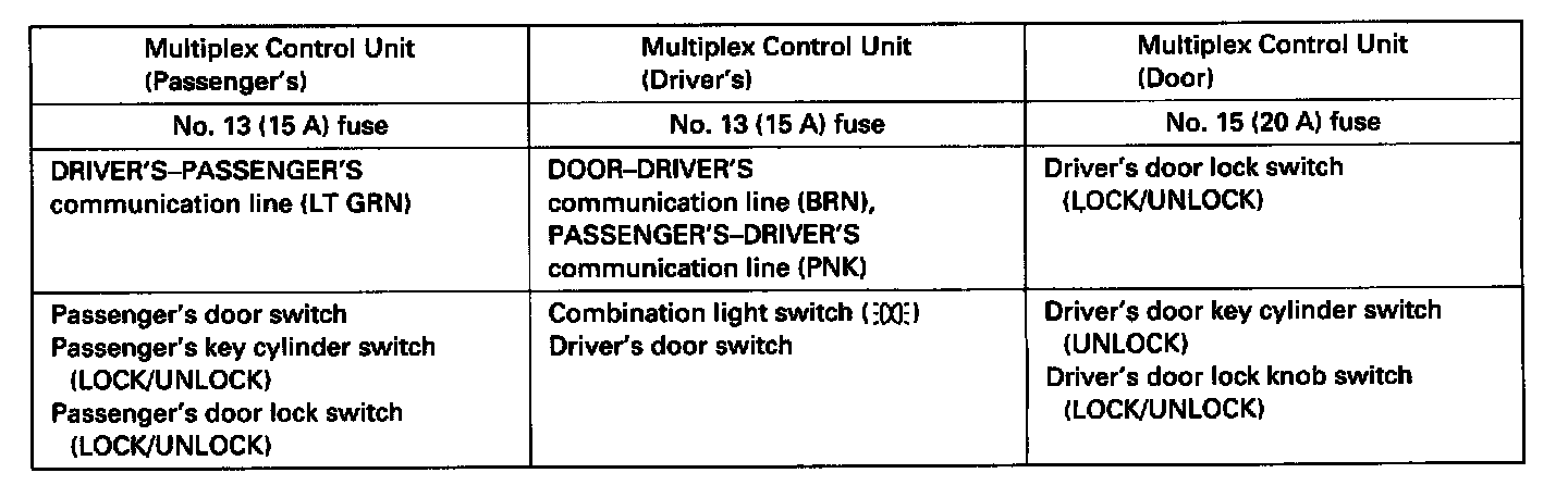 First, the multiplex control unit (door) wakes up, then the control unit starts to communicate to the control unit (driver's). By this communication, the control unit (driver's) wakes up. The control unit (driver's) wakes the control unit (passenger's) up by the communication line, and all the control units start to function.
