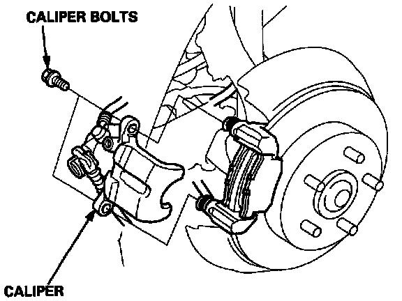 4. Hold the caliper pins with a thin, open-end wrench, and remove the two caliper bolts and the caliper from the bracket.