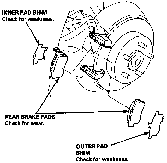 7. If the pad thickness is less than the service limit, replace the pads and shims together as a set.