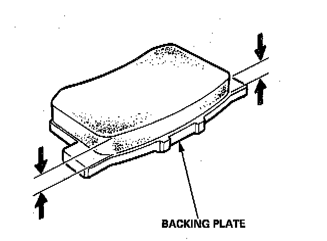 6. Using vernier calipers, measure the thickness of each brake pad lining. The measurement does not include the pad backing plate thickness.