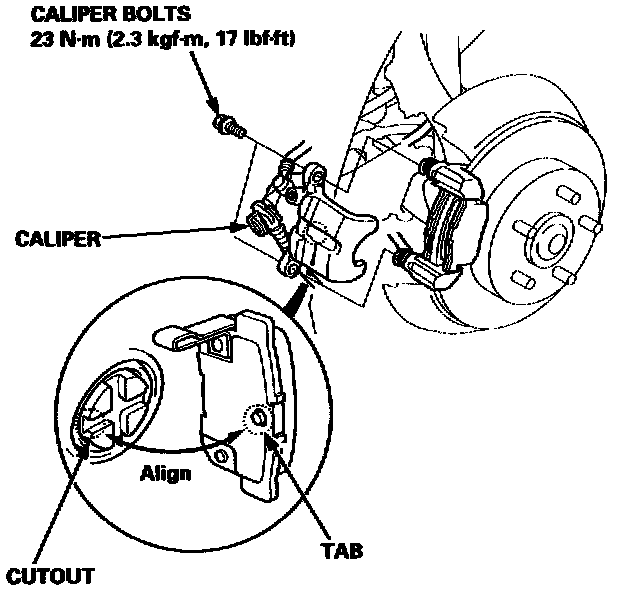 14. Rotate the caliper piston clockwise into the cylinder, then align the cutout in the piston with the tab on the inner pad by turning the piston back.