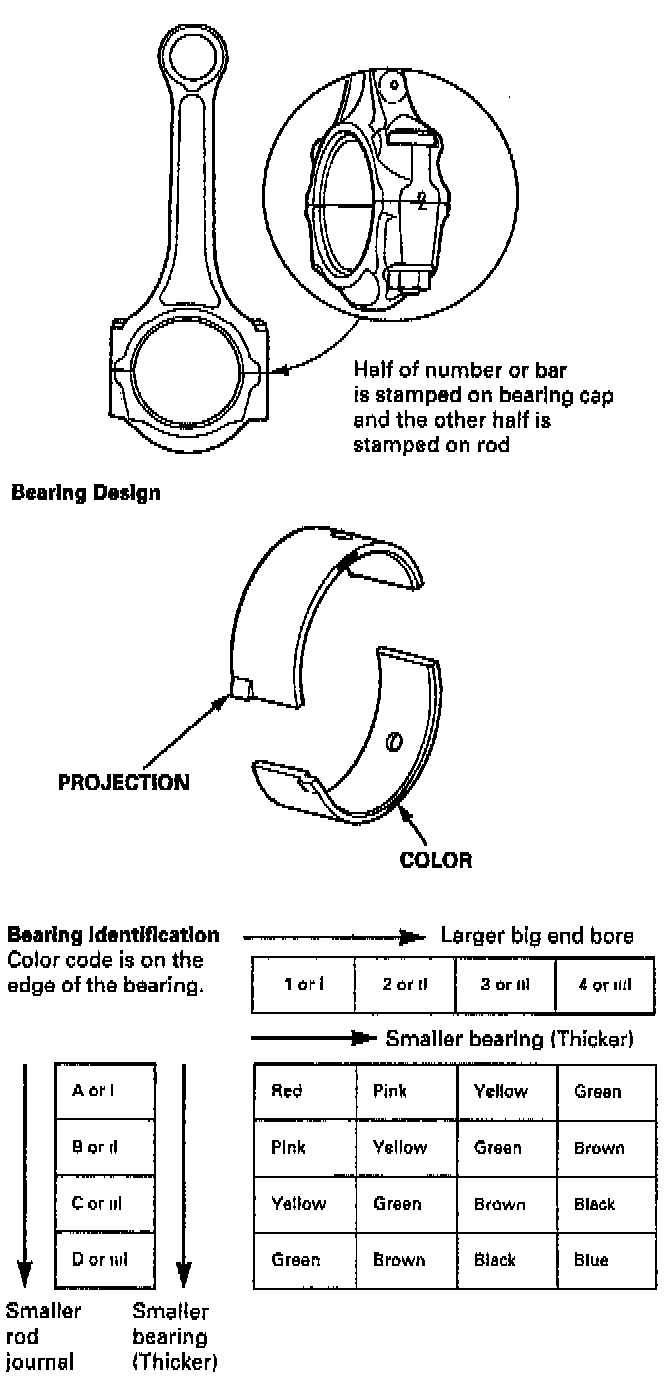 Numbers or Bars have been stamped on the side of each connecting rod as a code for the size of the big end. Use them, and the letters or bars stamped on the crank (codes for rod journal size), to choose the correct bearings.
