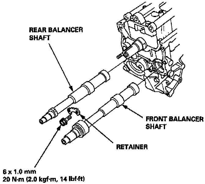 10. Insert the balancer shafts into the block, then install the retainer to the front balancer shaft and block.