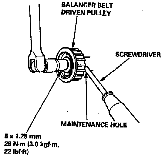 13. Hold the front balancer shaft with a screwdriver, then install the balancer belt driven pulley.