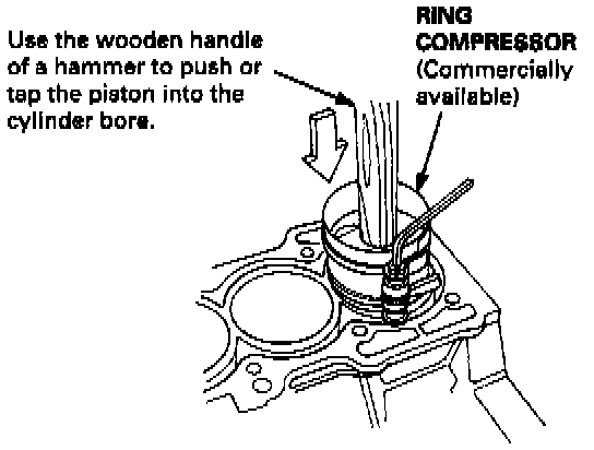 - Remove the rod caps and bearings, install the ring compressor, then position the piston in the cylinder and tap it in using the wooden handle of a hammer.