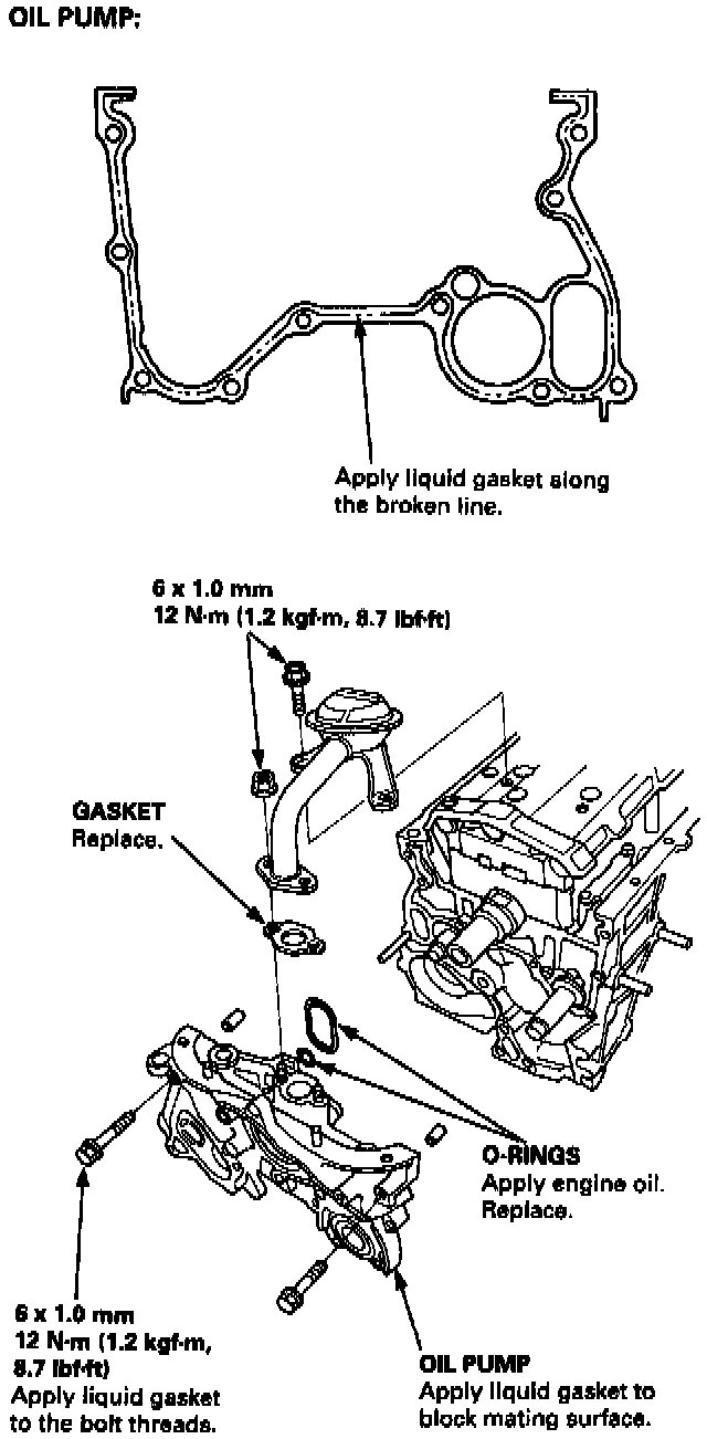 11. Apply liquid gasket to the oil pump mating surface of the block, then install the oil pump on the cylinder block.