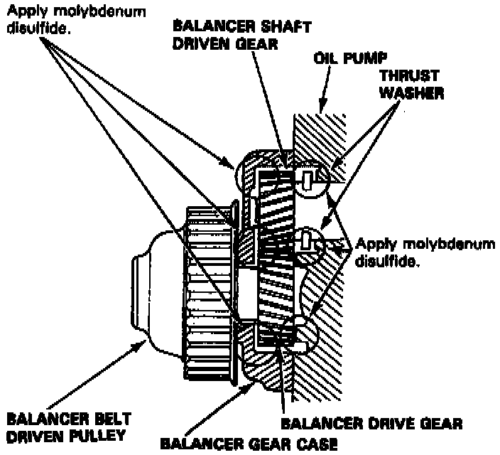 14. Before installing the balancer driven gear and the balancer gear case, apply molybdenum disulfide to the thrust surfaces of the balancer gears as shown.