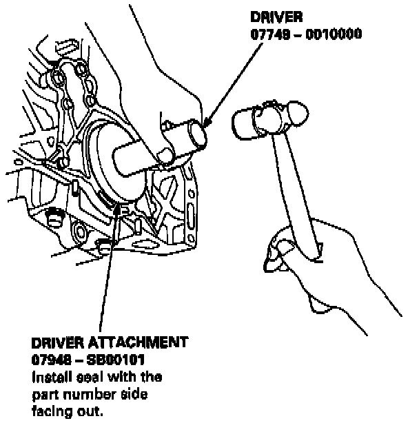 2. Using the special tool, press in the front balancer shaft oil seal until the driver bottoms against the oil pump. When the seal is in place, clean any excess grease off the balancer shaft, and check that the oil seal lip is not distorted.