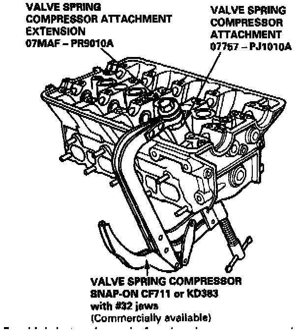 4. Install the valve spring and valve retainer, then install the valve spring compressor. Compress the spring and install the valve keepers.