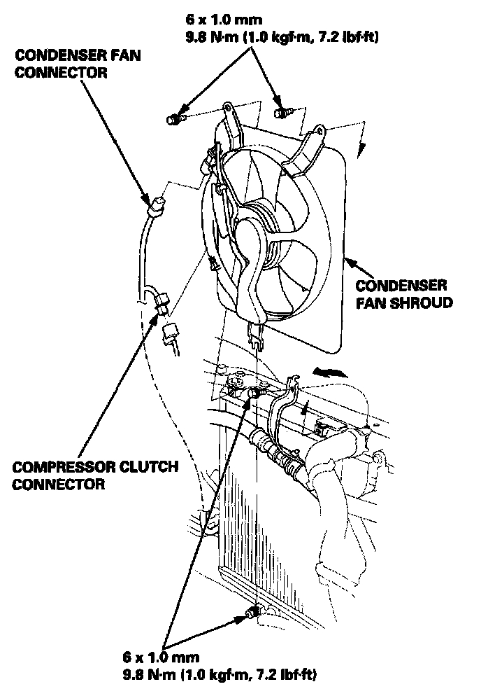 NOTE: Be careful not to damage the radiator fins when removing the condenser fan shroud.