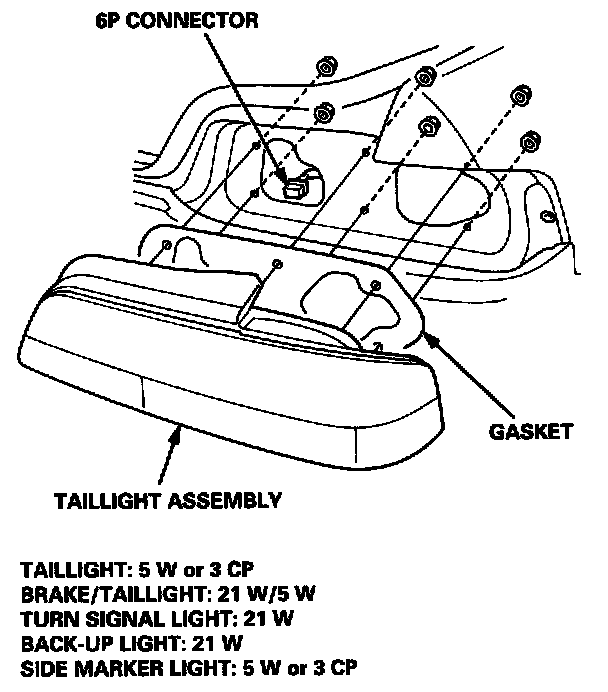 1. Open the trunk lid, and pull back the rear trim panel.2. Disconnect the 6P connector from the taillight assembly.