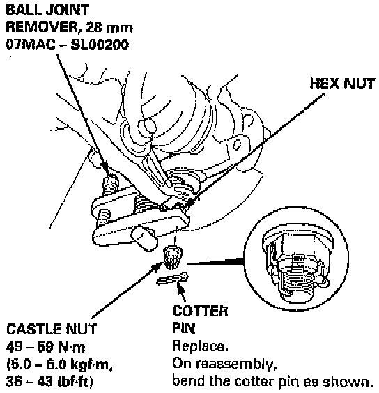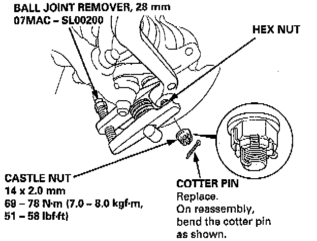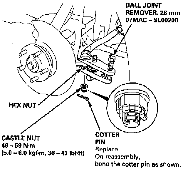 19. Install a 14 mm hex nut on the ball joint. Be sure that the hex nut is flush with the ball joint pin end, or the threaded section of the ball joint pin might be damaged by the ball joint remover.