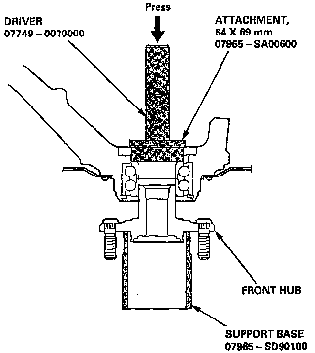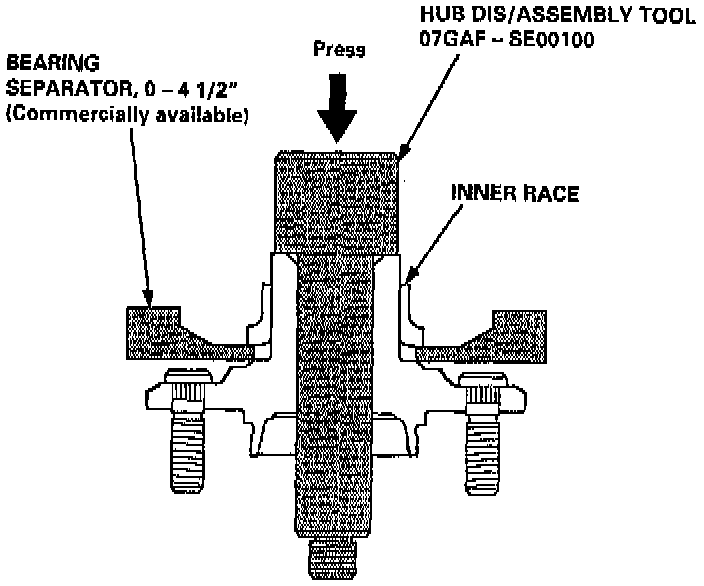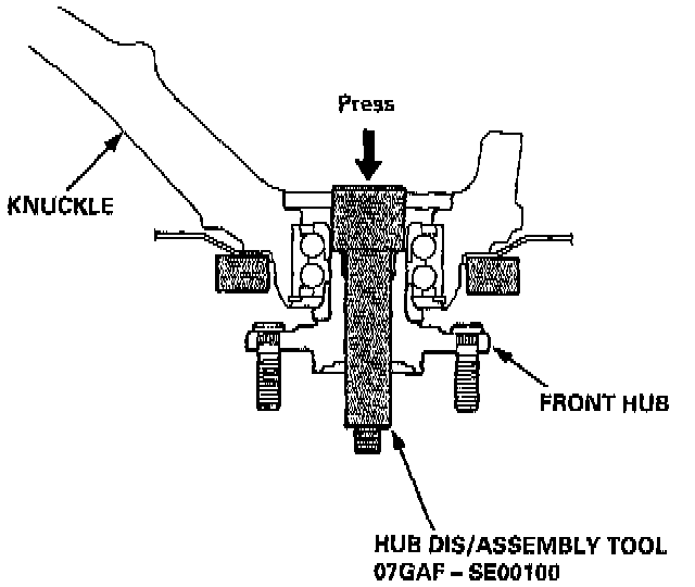 35. Install the hub on the knuckle using the special tools shown and a hydraulic press.